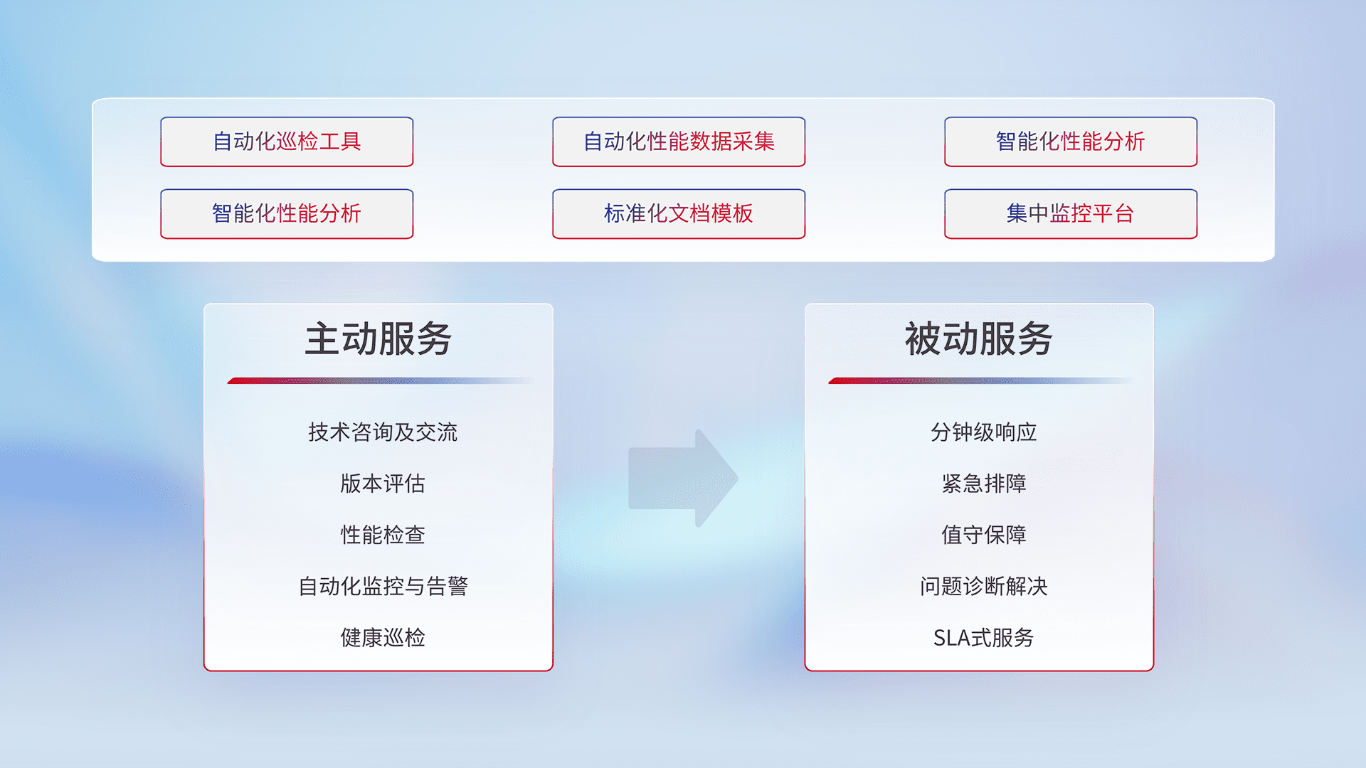 智能化工具和标准化文档,,,保障服务质量,,提供主动服务(包含技术咨询、、、、版本评估、、性能检查、、自动化监控与告警、、、、健康巡检)和被动服务包含(分钟级响应、、、、紧急排障、、、、值守保障、、、问题诊断解决、、SLA服务)。。